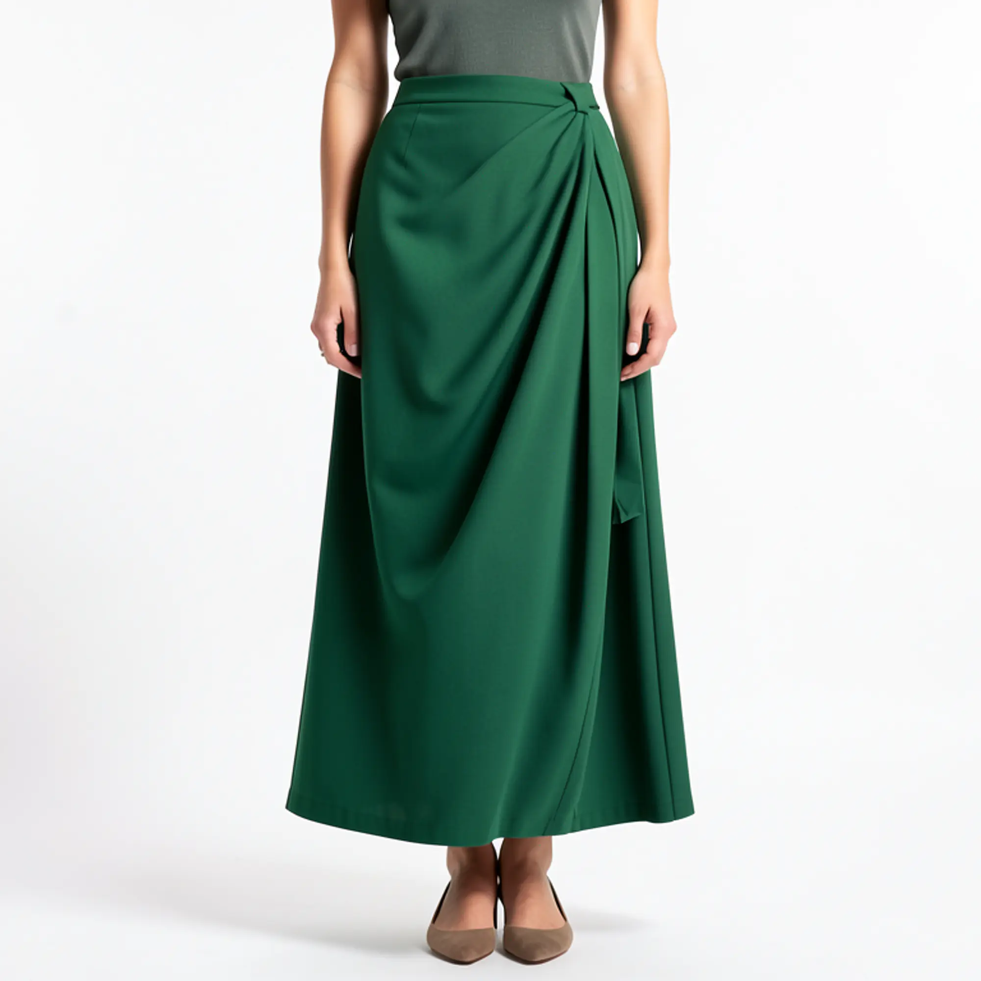 Elevate your wardrobe with this beautifully draped midi skirt, featuring a flattering high-waist design and subtle pleating that creates an effortlessly elegant silhouette. The versatile length pairs perfectly with both casual and dressy tops, while the comfortable elastic waistband ensures all-day wearability. Available in sophisticated shades of green, blue, and grey, this essential piece transitions seamlessly from office to evening events with graceful ease.
