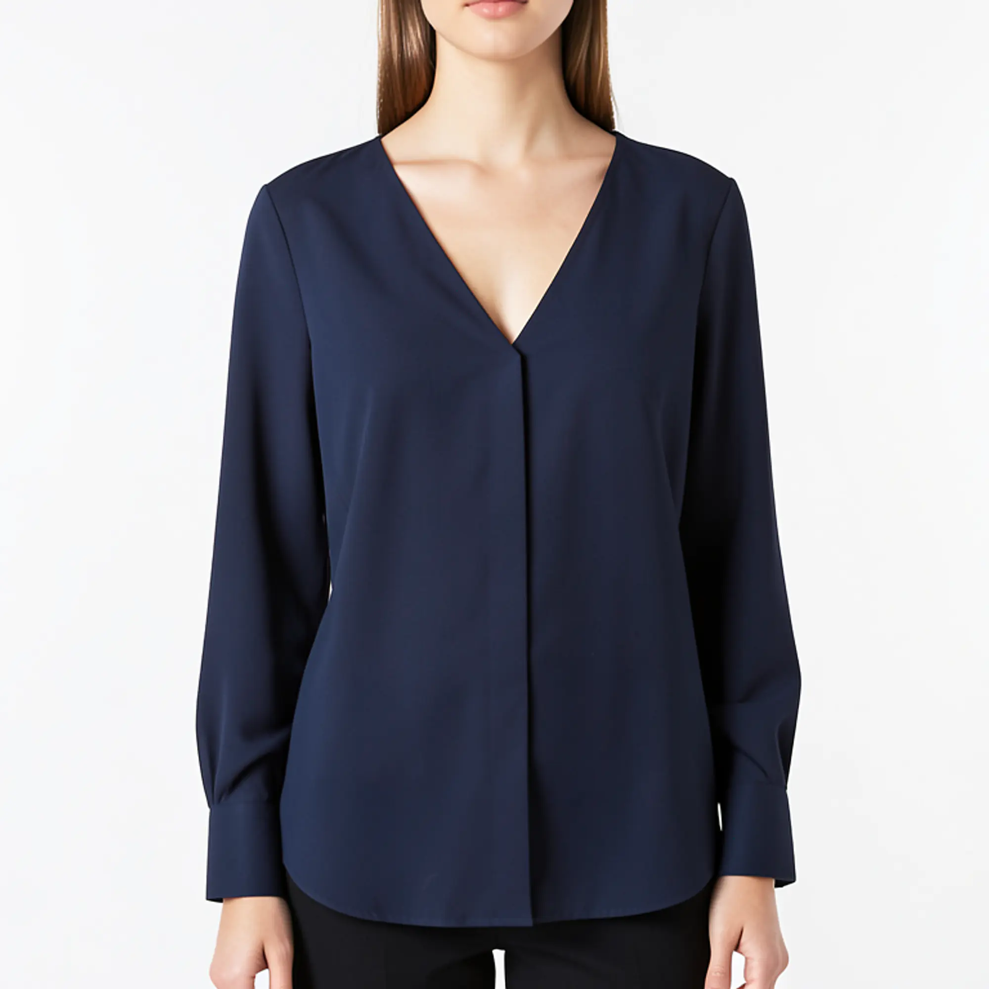 This effortlessly chic V-neck blouse features a relaxed silhouette with dropped shoulders and a graceful wide cut that drapes beautifully over any figure. The timeless design transitions seamlessly from office to evening, while the versatile dark blue and white options make it a perfect foundation piece for countless style combinations.